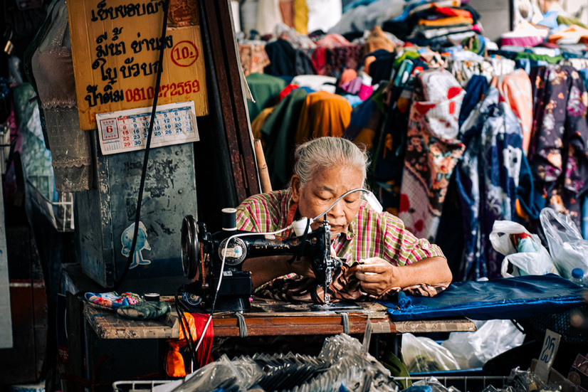 Warorot’s back alleys are where stories breathe. I met an elderly woman sewing clothes near the curb, her machine humming steadily. Her face was calm, almost meditative. We exchanged smiles and a few words. Then I saw another woman hunched over worn shoes, fixing soles with weathered hands. Both women were creators—repairing, sewing, restoring.